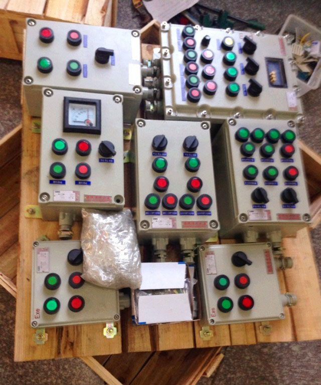 二、防爆控制箱。此類防爆控制箱型號(hào)為BXK52系列,其中X是箱體的簡稱,K為控制的縮寫。防爆控制箱主要用于控制各類電機(jī)或者輔助電器,主要由防爆按鈕和防爆指示燈組成。防爆控制箱箱體材料一般分為三種,即鋁合金、鋼板焊接和不銹鋼焊接。防爆控制箱箱體除安裝上述按鈕和指示燈外,還可以根據(jù)客戶要求安裝轉(zhuǎn)換開關(guān)、電流表、電壓表以及制定的各類儀表。